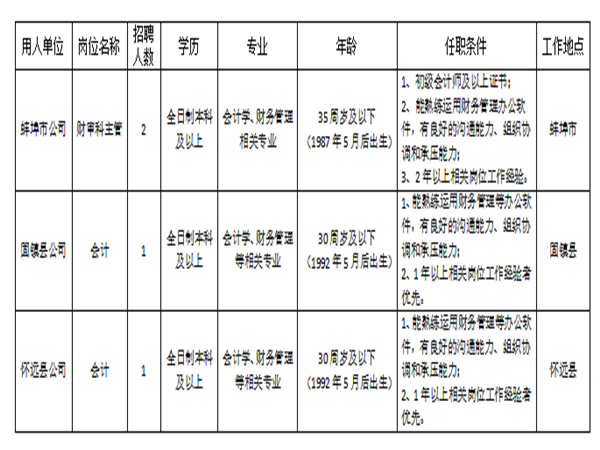 1、市公司財審主管:男女不限,全日制本科及以上學(xué)歷,年齡35周歲及以下,會計學(xué)、財務(wù)管理相關(guān)專業(yè);初級會計師及以上證書,熟練運(yùn)用財務(wù)管理辦公軟件,有良好的溝通能力、組織協(xié)調(diào)和承壓能力;2年以上相關(guān)崗位工作經(jīng)驗。